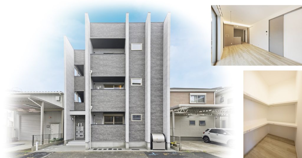 間取り1LDK、専有面積40.16~40.23㎡。3階建て6戸の木造。白とグレーで統一された室内はシックな印象を与え、LDKには間接照明が設置されているため、高級感のある仕上がりに。またキッチン横にパントリーを設けた部屋もあり、高級感だけでなく住みやすさも両立させた物件となっております。