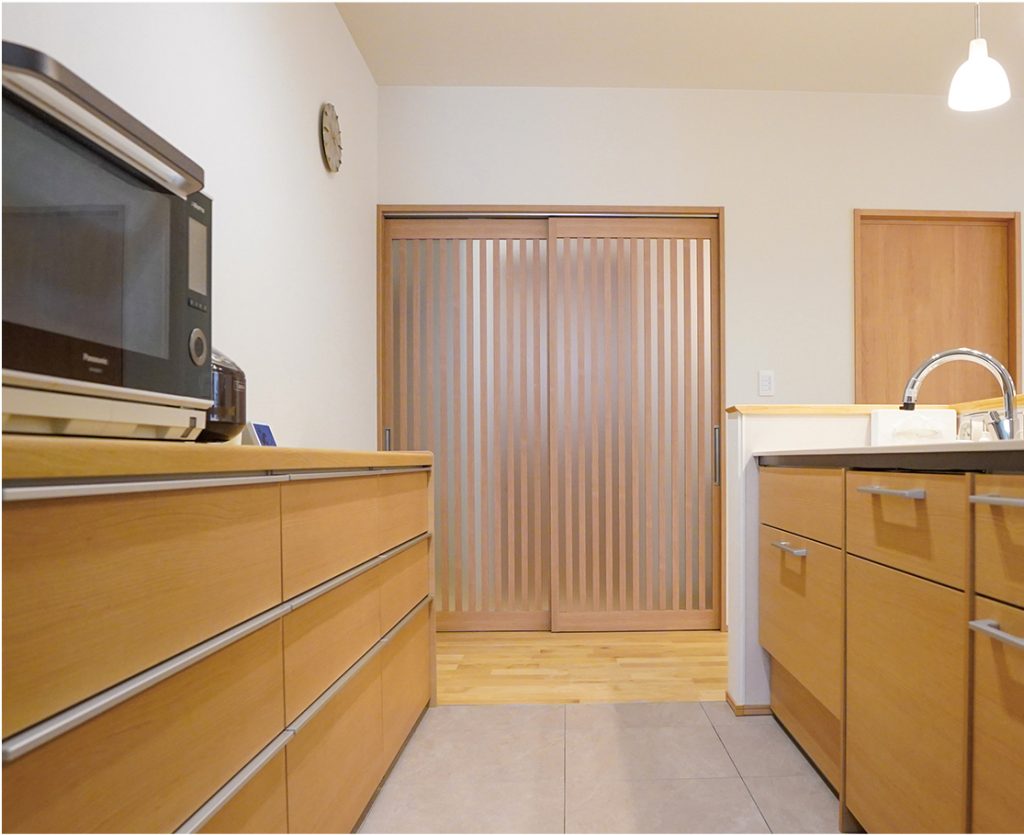 玄関からLDKへとつながる格子戸が印象的で、水回り以外のフロアには無垢材を採用。素足でも心地よく、木の温もりを日々感じられる空間に仕上がりました。