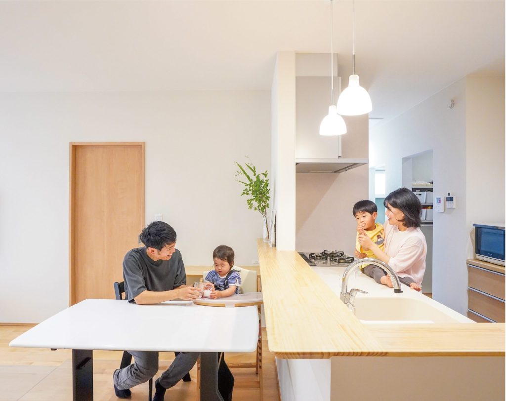 やわらかな光に包まれたカウンターキッチンは、家族の会話が自然と生まれる場所。対面式で料理中も子どもたちの様子が見えて安心。ナチュラルな木の素材感が、暮らしに温もりを添えてくれます。