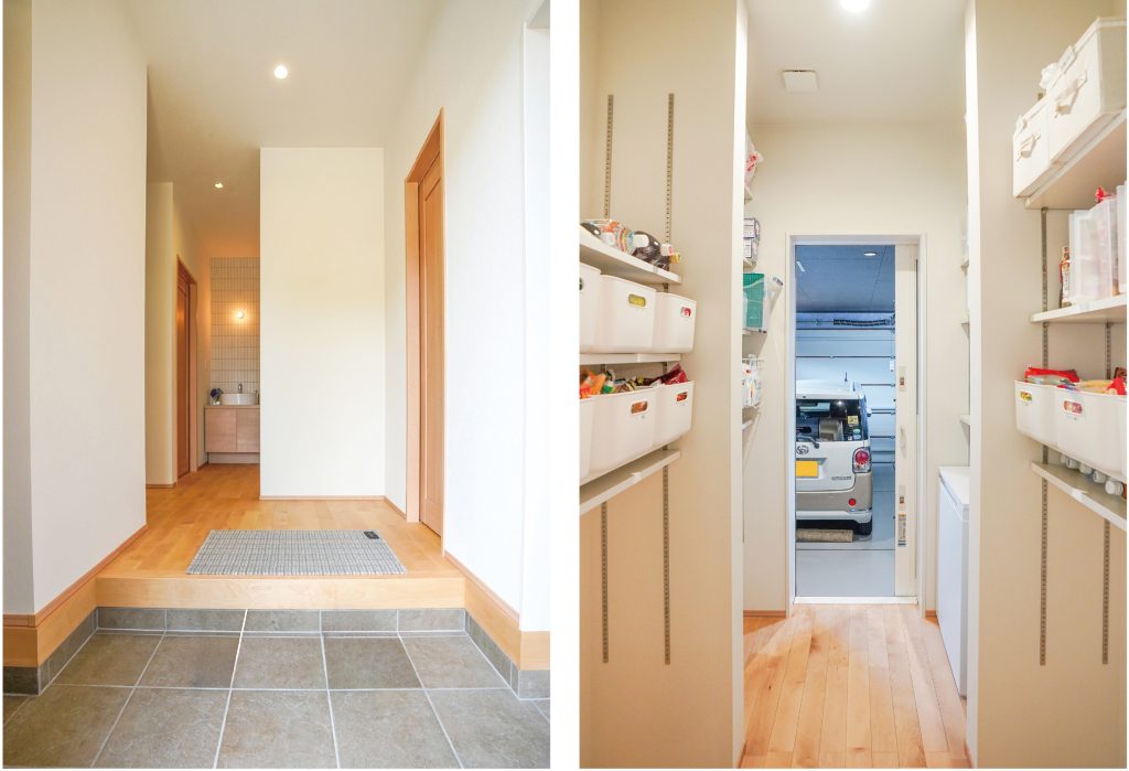 趣のある玄関と、ガレージ直結のパントリー。使いやすさと心地よさを兼ね備えた、お気に入りの空間です。
