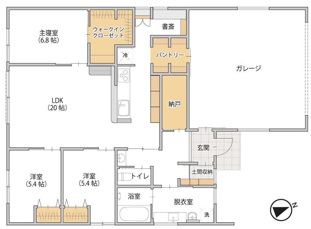 第二子の妊娠を機に「年子の育児には、そろそろ自分たちの家を」と家づくりを決意されたご夫婦。完成したのは、塗り壁と木目調ガレージシャッターが調和する外観がやさしい和モダンの平屋です。