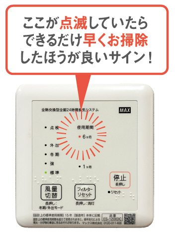 定期点検のすすめも3回目になりました。今回は24時間換気システム編になります。定期点検では、配管の脱落や作動不良が無いかなどを確認させていただきますが、1ヶ月に1度、お施主様自身で点検とお手入れを推奨されている項目があるのをご存知でしょうか?そこで、今回は24時間換気システムのお手入れ方法をご紹介します。※今回対象製品:マックス EX-1200DC