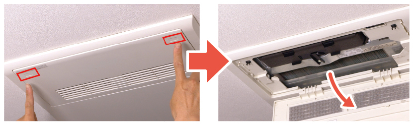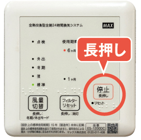 ブレーカーを上げ、風量切替ボタンを押して電源を入れる。電源がついたら、フィルターリセットボタンを3秒程度長押しします。使用期間のランプが消えればお掃除完了です!