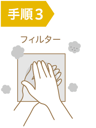 フィルターについた虫やホコリを、手で軽くはたく、掃除機で軽く吸い取るなどして、汚れを落とします。