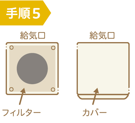 カバー、フィルター、給気口、全てが完全に乾燥したのを確認してから、フィルターとカバーを元に戻して完了です。
