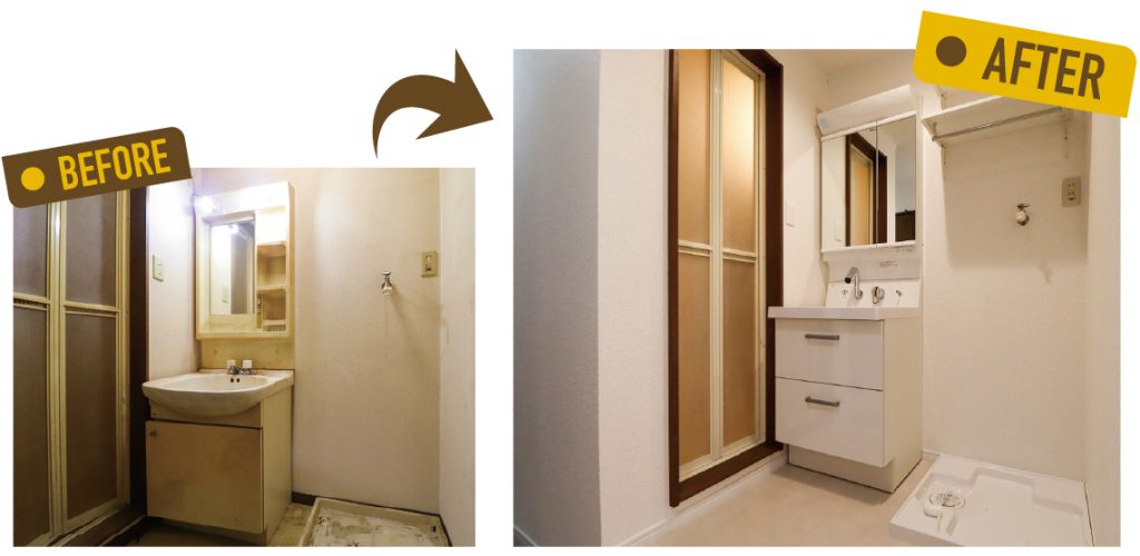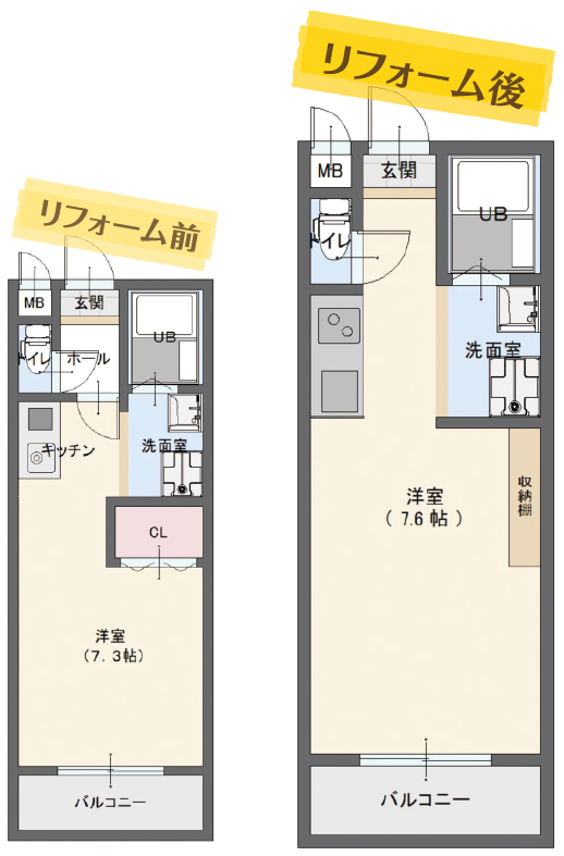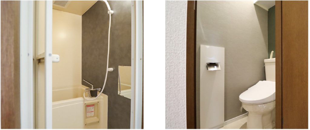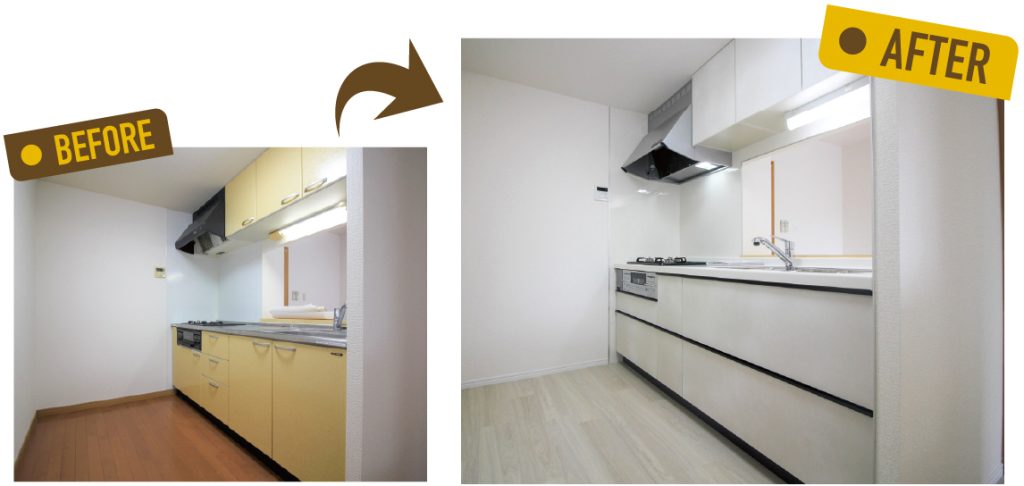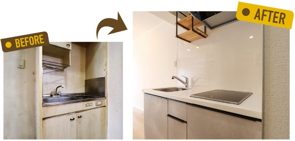 単身向け1Kのお部屋のクローゼットと扉を無くし、オープン収納にすることで、広さを感じられるお部屋に変身。洋室にはアクセントクロスやダウンライトとスポットライトを組み合わせて採用し、築年数を感じさせない洗練された仕上がりになりました。照明は色温度を変更できるタイプなので、気分によってお部屋の雰囲気を変えられます。さらに、キッチンは幅900mmから1500mmに、IHヒーターを1口から2口に変更。作業スペースも確保し、使いやすくなりました。若い方にもスタイリッシュに暮らしていただけるお部屋に生まれ変わりました。