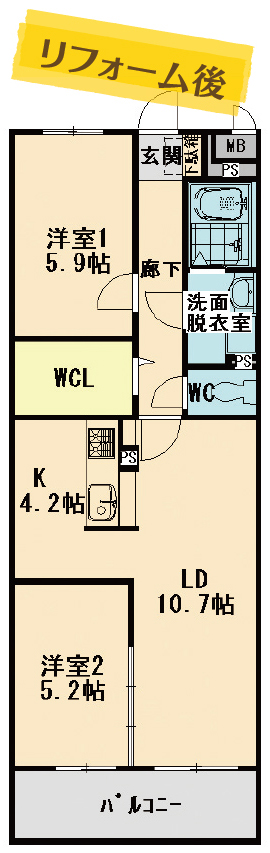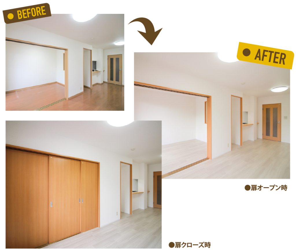 元々、単身者や新婚ご夫婦に最適な広さがある2LDKでしたが、お部屋をさらにご入居される方の自由度が増す空間へ。キッチンにつながるリビングは白を基調に明るく、洋室につながる3枚引き戸をオープンすると15帖大の空間になり、来客時も心配がありません。キッチンは幅約2.1mのワイドサイズでキッチンタイムも楽しくなります。真ん中にWICを配し衣類など毎日使うものをまとめて片付けられる収納も完備。快適さをさらにご提供できるお部屋に仕上がりました。