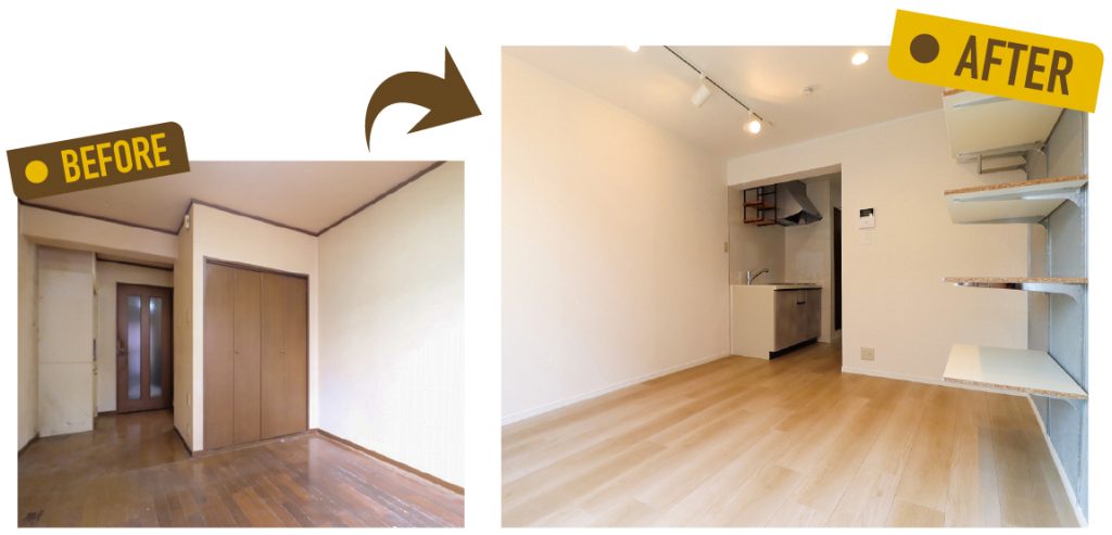 ●工事予算:約180万円 ●家賃:45,000円 ●共益費:4,000円 ●間取:1R ●部屋面積:22.80㎡ ●築年数:30年