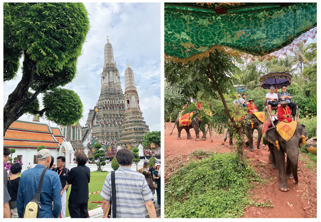 10月31日(金)・11月1日(土)の2日間は、現地での観光をお楽しみいただくためのオプショナルツアーをご用意いたしました。「水上マーケット・象乗り体験」のツアーでは、ロングテールボートで運河を進み、水上マーケットでは昔ながらの商い風景を堪能。現地での暮らしや文化に触れる貴重な時間となりました。夕食のディナークルーズでは、綺麗な夜景に皆様の気分も高まっておりました! また、「バンコク市内の寺院巡りやお買い物」では、ワットアルン(暁の寺)・ワットポー(涅槃寺)を訪問。黄金色に輝く巨大な涅槃仏様は、高さ約15m・全長約46mと、目を見張るような迫力のある姿でした! 日本国で見る仏様とは異なる文化や造形美を感じるひとときとなりました。