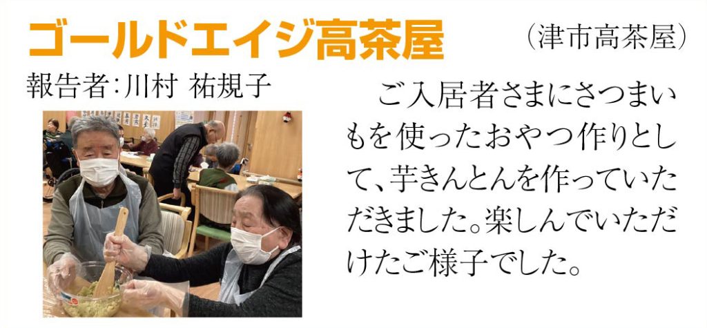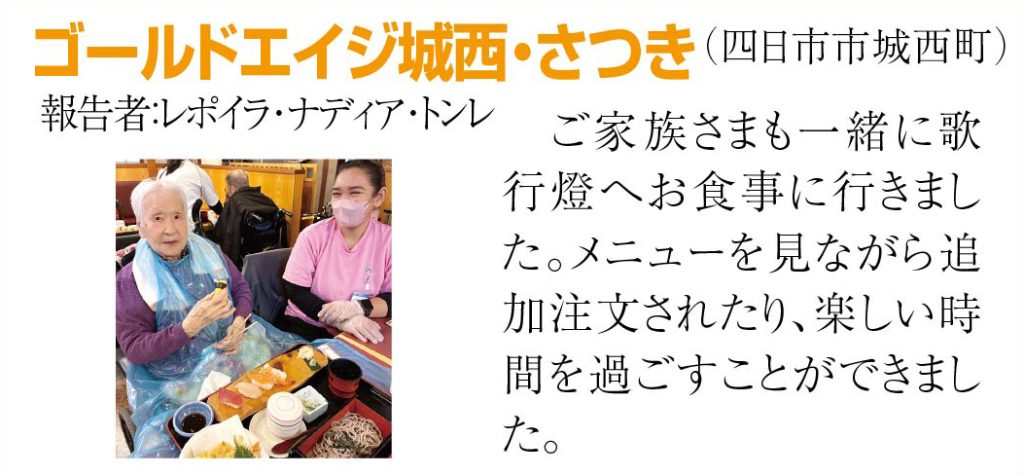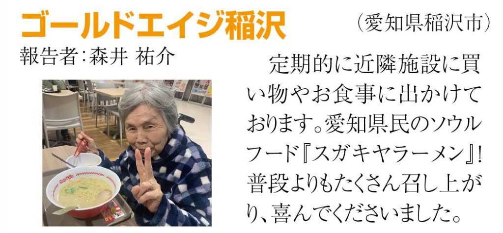 例を上げますと、(思い出の場所での記念撮影)(お誕生日の家族での食事会)(入院・退院の付き添い)(一時帰宅支援)(入居時のお祝いイベント)(身元保証の代行)(外出日帰り旅行)(特別食やもう一皿追加の食事)(引越し代行)(散歩の付き添い)(洗濯・洗剤購入代行)(オムツ販売)(想い出整理サポート)(不用品回収)(有償リハビリ)(自宅売買の代行)(自宅の管理) (遺言作成代行)(エンディングノートの作成)(定期衣類セット販売)(自宅のバリアフリー)(訪問時のご家族への食事提供)(退院のお祝い会)(家族への感謝状贈呈)(ゲスト宿泊ルームの利用)(行政手続き代行)(少額短期保険の手続き)(生前の自宅整理支援)その他色々。何かご希望があればお知らせください。
