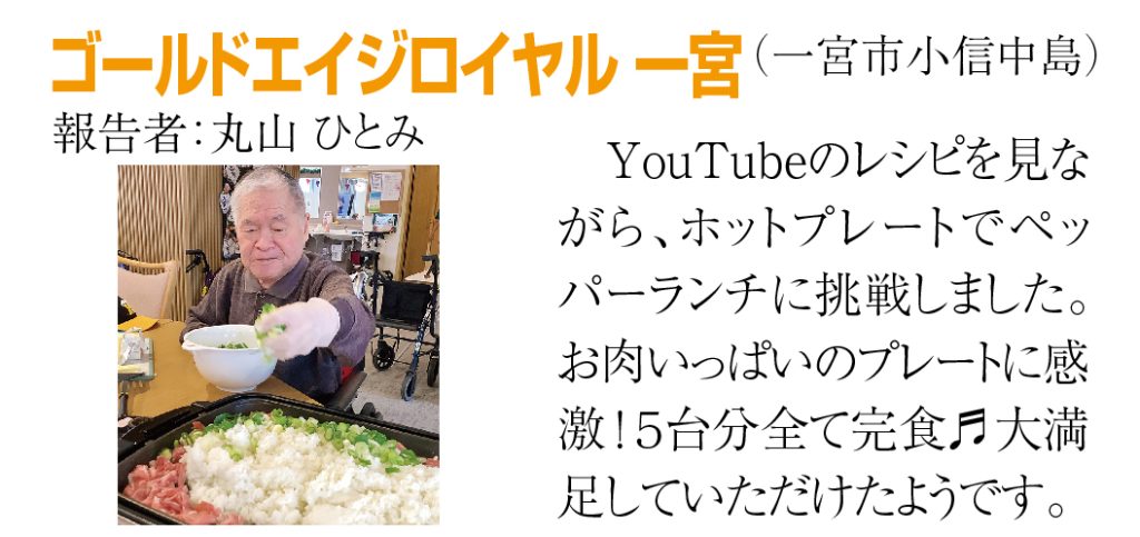 厨房職員の加藤さんはいつも手際よく作業を進めてくれて、忙しい時間帯にも大きな力となっています。バイキングでは積極的にメニューを考案し、厨房全体を明るく引っ張ってくれています。これからも美味しい食事をどうぞよろしくお願いします!