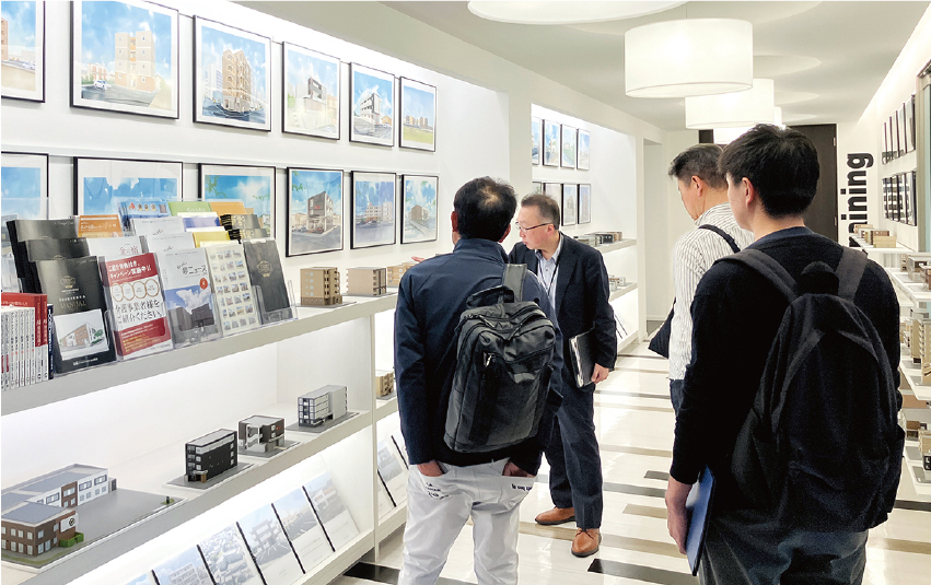 昼食後は、弊社会長久保川の創業地である四日市市のグループ企業本社にて、過去の建築資料や模型などの見学や、実際にどのような企業なのかをご紹介させていただきました。