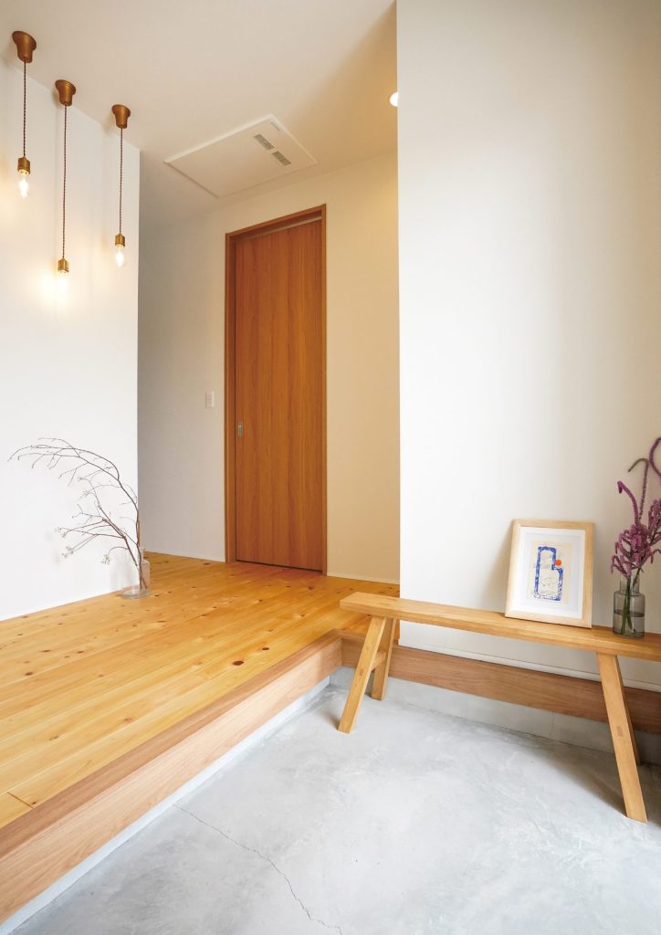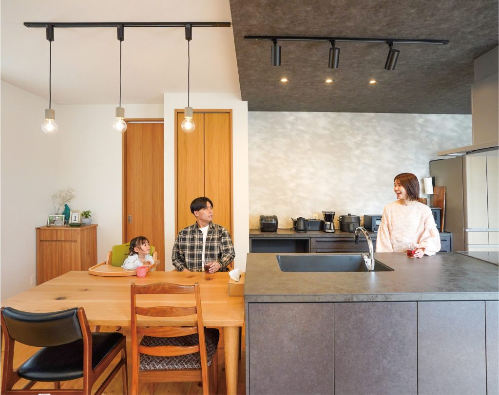 「老後まで家族とともに成長できる家」をテーマに家づくりを始めたI様。1階にはすべて無垢床を採用したり、玄関にはモルタルを施したりするなど、時を重ねるごとに味わい深く変化する素材の表情が愉しめるお家となりました。