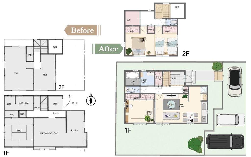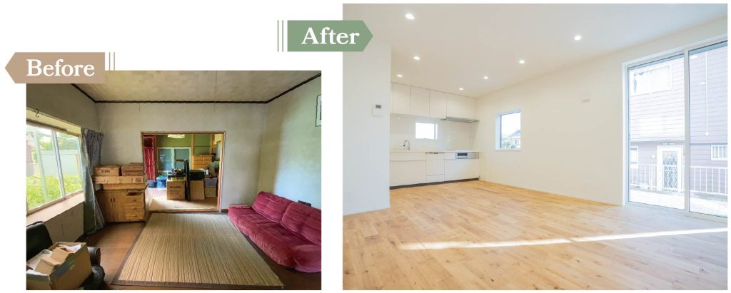 築38年の木造住宅が、一級建築士とインテリアコーディネーターの提案で使いやすくておしゃれな3LDK住宅に大変身!外観は色や屋根の形状も一新し、まるで新築のような仕上がりに大変身。内装も白を基調に無垢の床材を合わせ、明るく温かみのある空間に。オール電化&IOT対応のスマートホームで、さらに便利に快適に毎日を暮らしていただける家にフルリノベーションした事例をご紹介します。