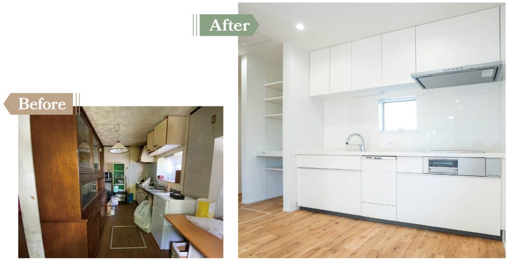 昔ながらの暗くて狭いキッチンは、LDと一体となり、明るく家族の気配を感じながらお料理ができるスペースに。奥側には冷蔵庫も置ける大容量パントリーを設け、生活感を隠せる工夫を施しています。