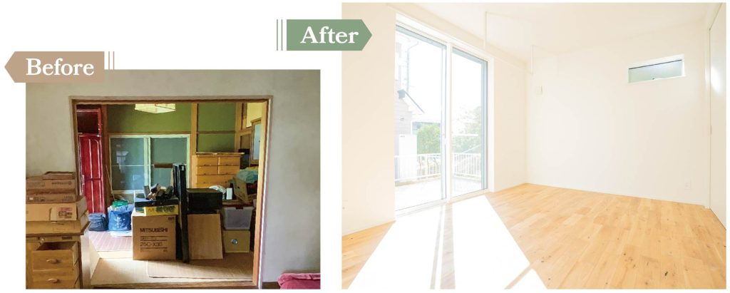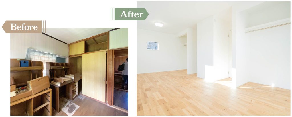 LDKの奥の和室だった場所は、壁一面のクローゼットを備える6.4帖の洋室に。仕事部屋として、趣味室として、将来は1階主寝室として、自由に使える使い勝手の良いお部屋になりました。