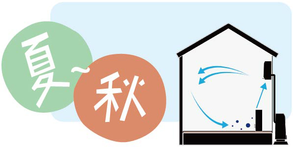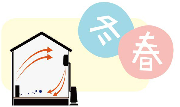 暖房を付けると温かい空気は上昇します。この原理を使って、エアコンの風向きを下に設定しエアコンの反対側に空気清浄機を置くことで、暖かい空気が一度下に向かい、空気清浄機に花粉が吸いこまれます。