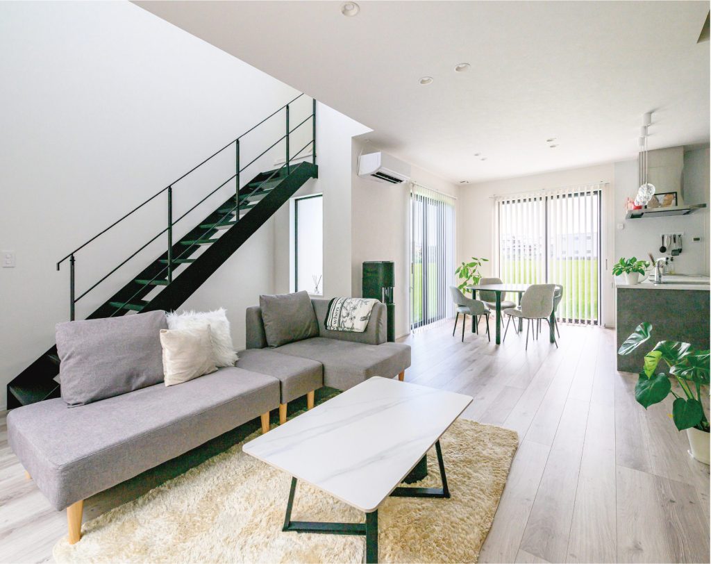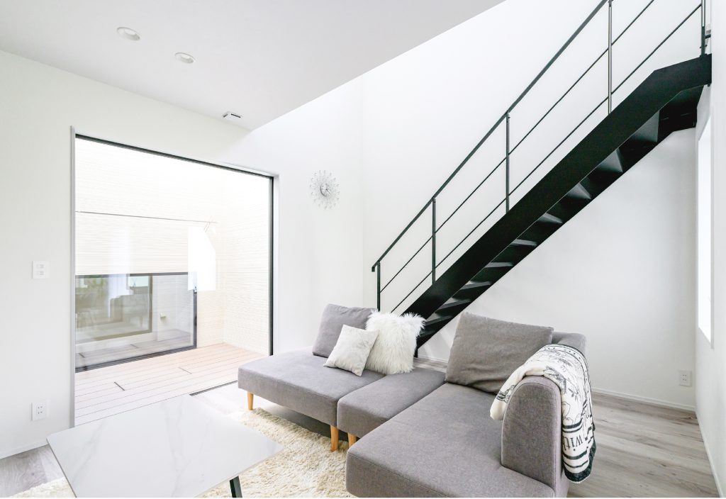 大きな吹き抜けと中庭からの光が差し込む、開放感あふれるリビング。シンプルで洗練されたインテリアがホテルライクな上質感を演出し、日常を特別な時間に変えてくれます。